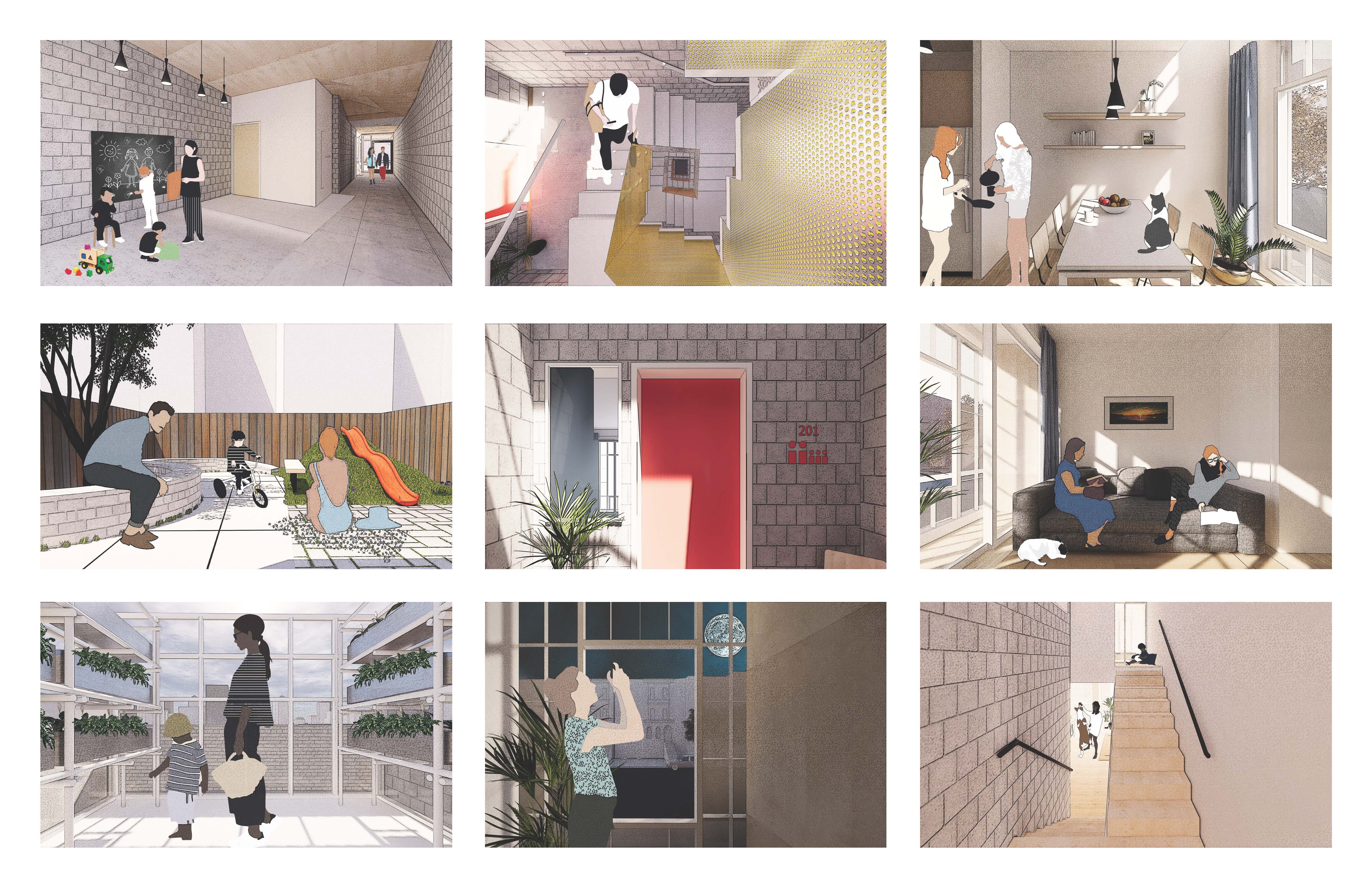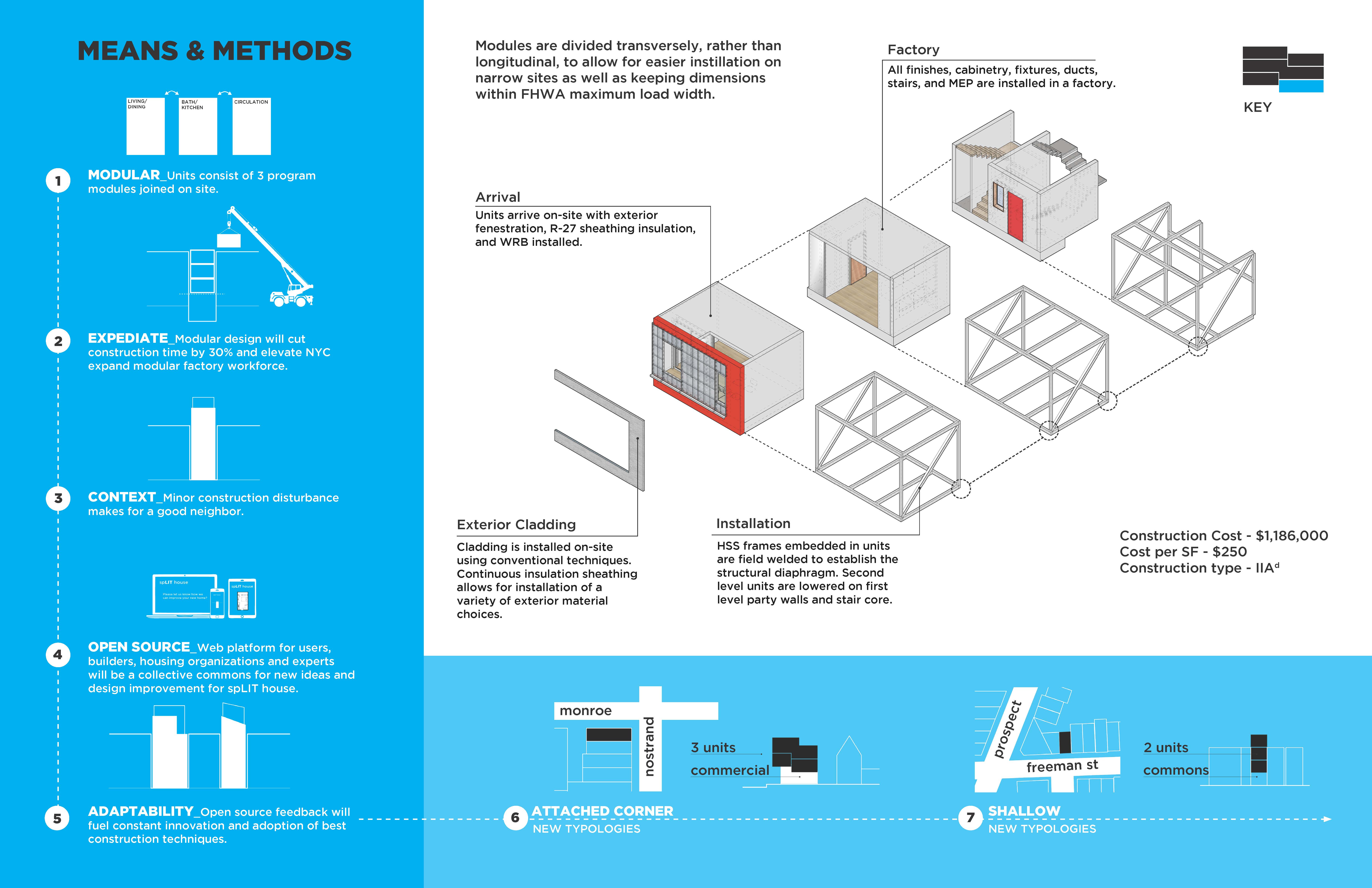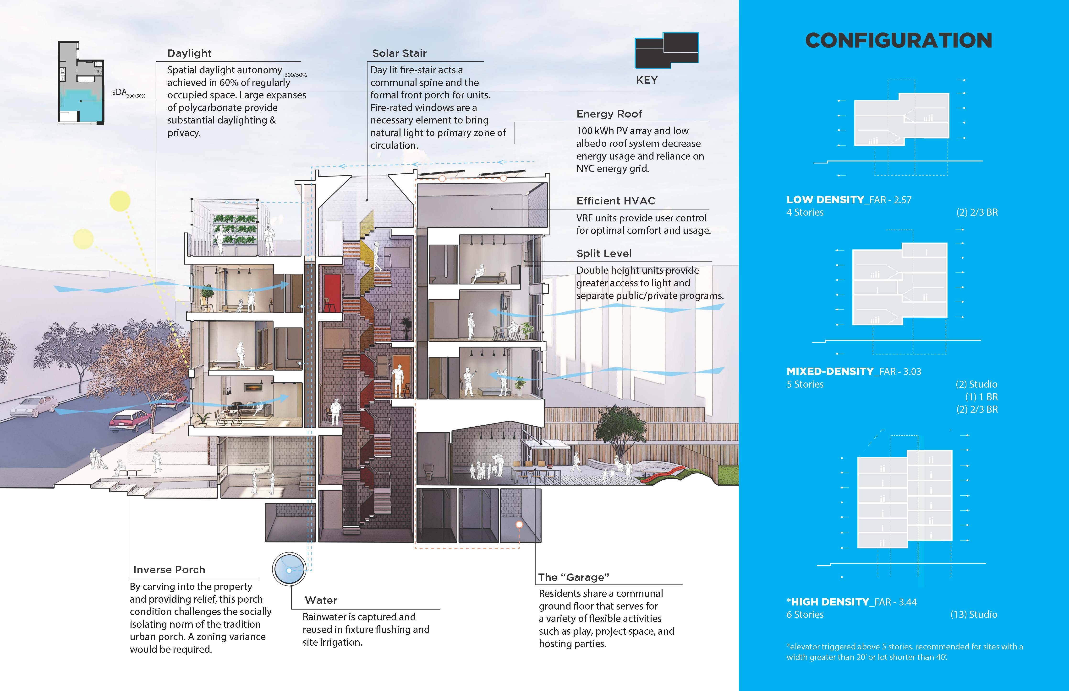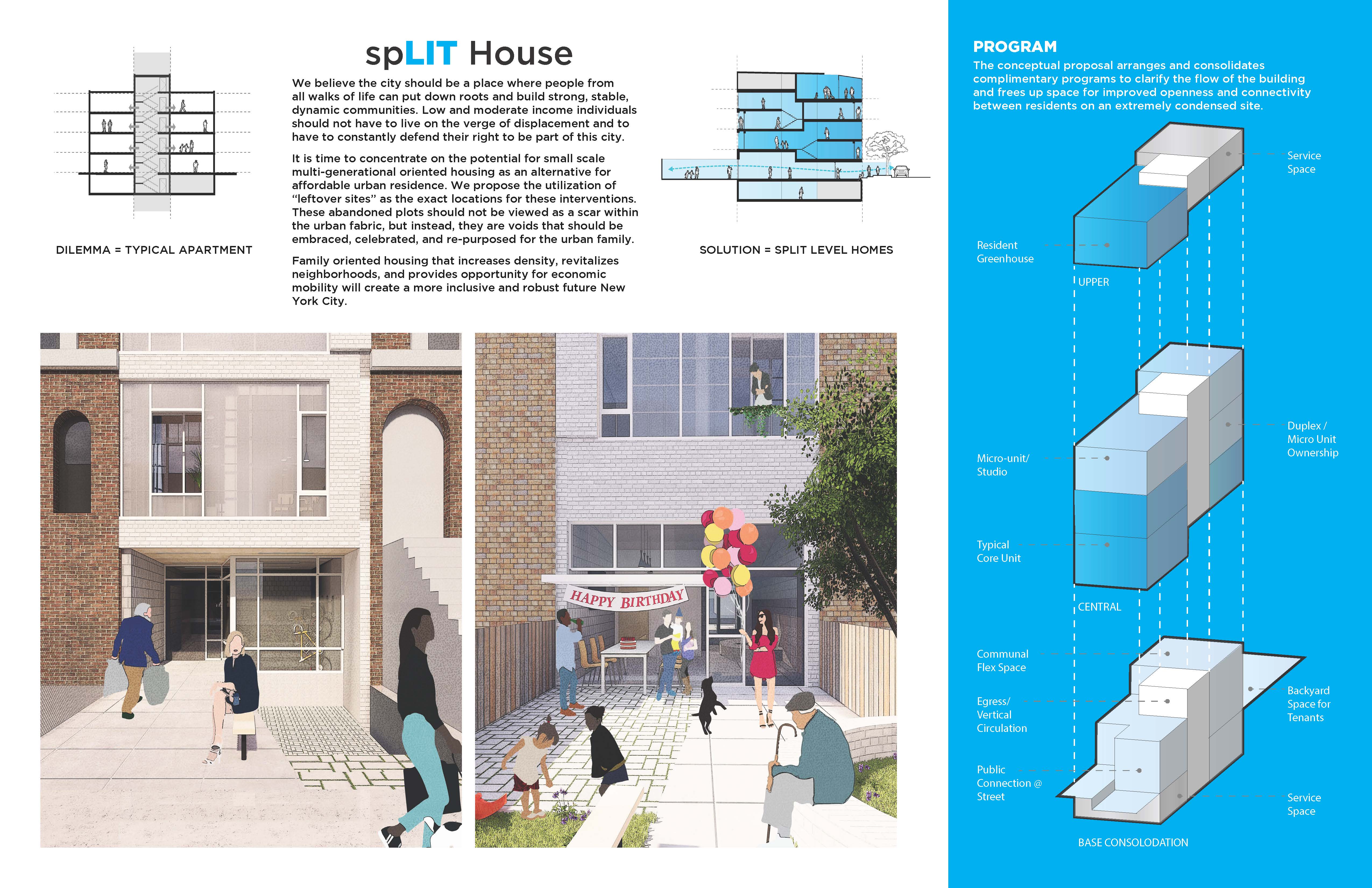 New York City’s lack of affordable housing impacts families of all different types. Split House residential units are designed with adaptability and growth as the basis behind each layout. Each floor level is split down the middle and offset 5’-0” in height allowing for maximum efficiency of the central stair. This vertical circulation core acts as the “front porch” for each home creating a sense of community between neighboring units. “Breakaway” walls dividing each unit provide sound & fire protection while allowing the potential for the wall to be removed for future growth. This design approach provides access to affordable housing across all scales of family typologies. Paired with a rent-to-own initiative, this unique typology offers access to housing and generational wealth to thousands of NYC.