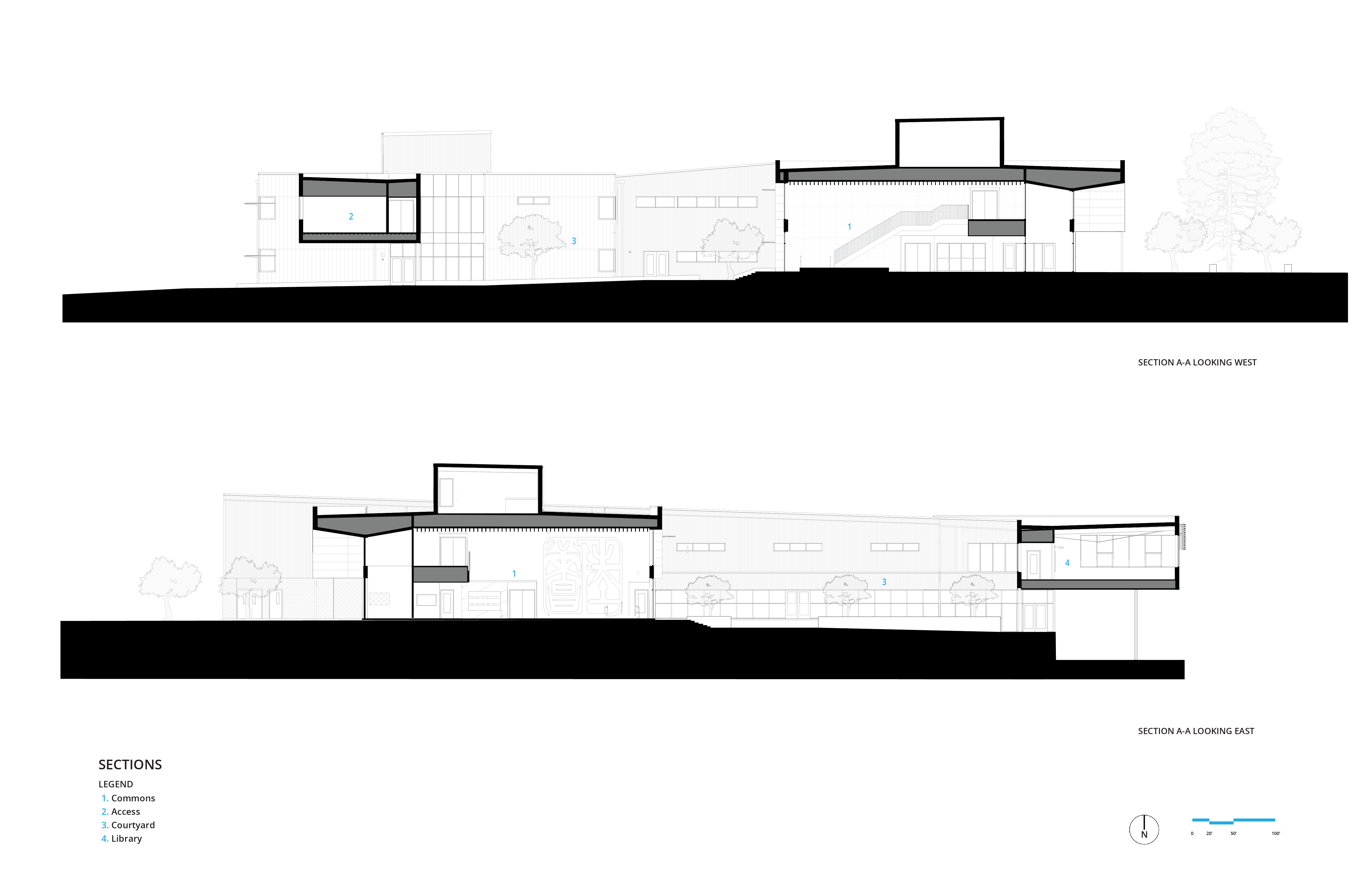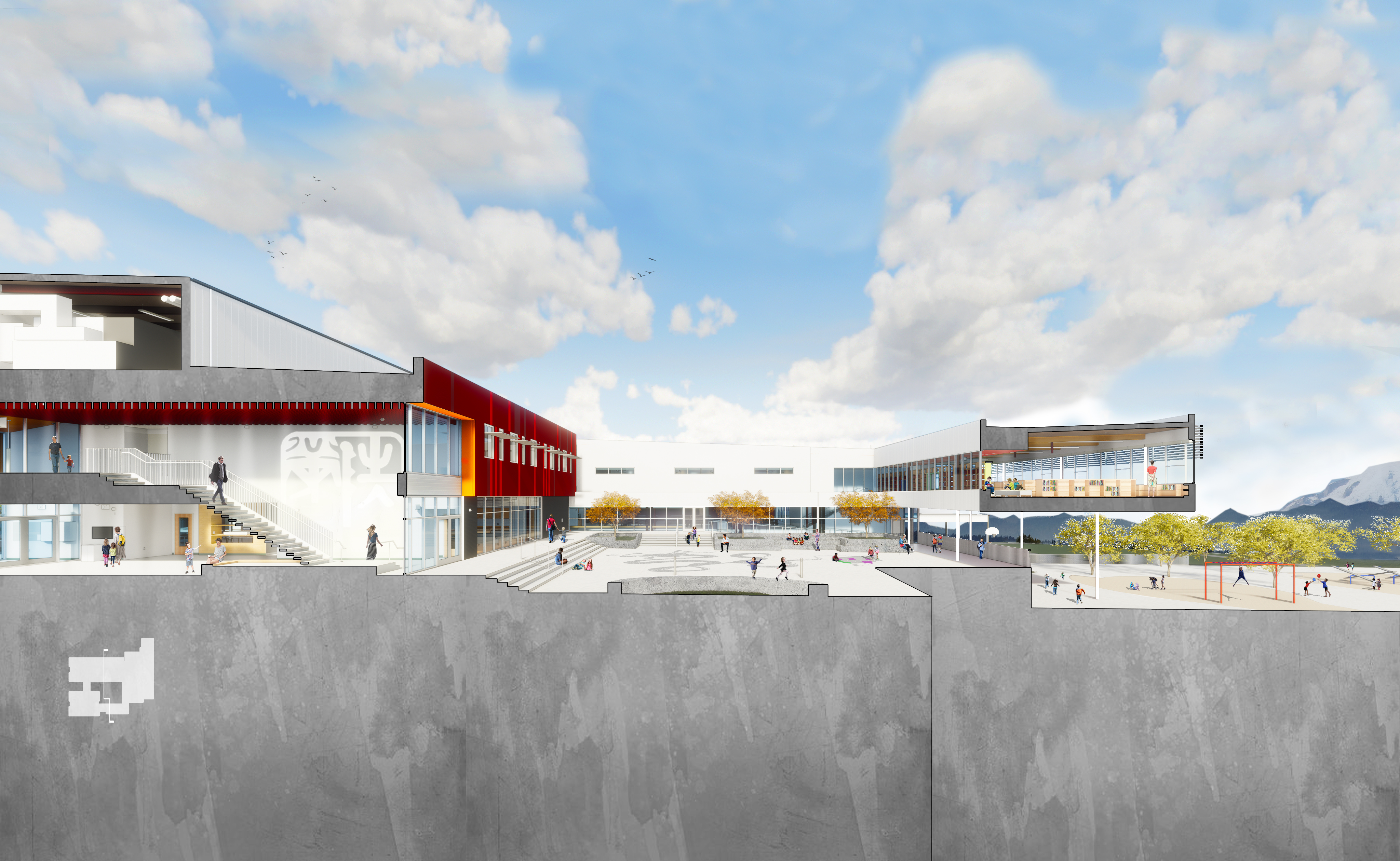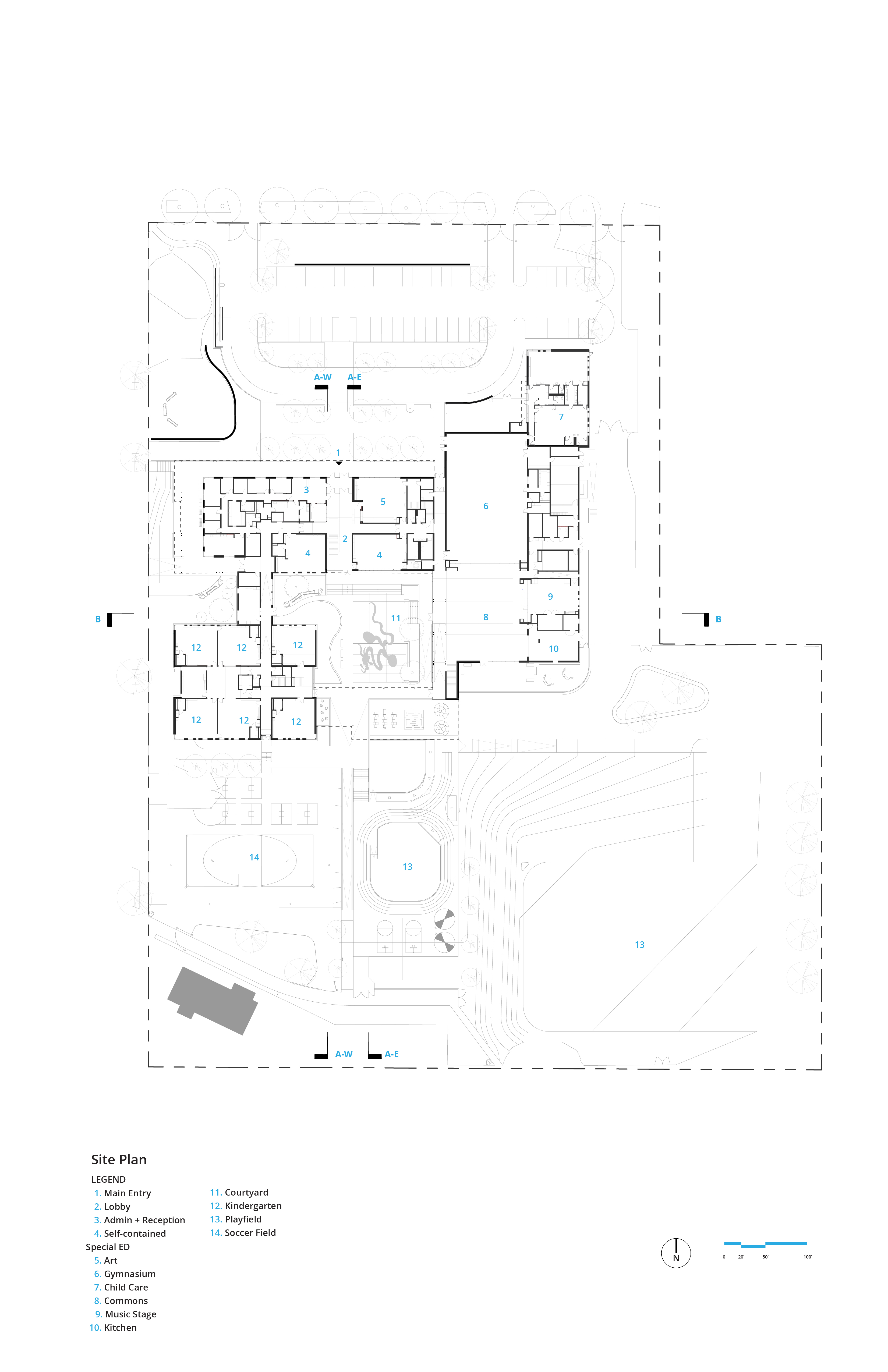 Wing Luke’s diverse student population merits an architecture that celebrates and elevates the recognition of those cultures. The school identity is best represented by the central courtyard which is designed as space to gather as a school community. A variety of programs such as the lobby, gym, and library open up to the courtyard offering constant visual and physical connection. This central space is inherently introverted, surrounded by the school, but a soaring second-floor library frames the view towards Mt. Rainier beyond and is a gateway to the play area to the south. The site drops 40 feet as one moves from the north parking to the southern play space. This offers a unique architectural language that steps with the landscape in a gracious and spatially rich manner. Early elevations illustrate explorations of academic building masses moving down the site.